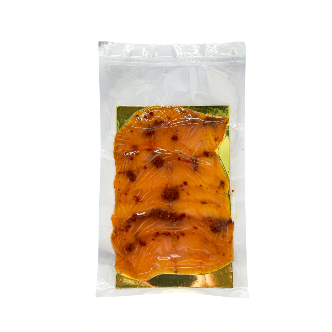 Saumon délicatement fumé, infusé d'épices nord-africaines chaudes et d'une harissa soyeuse.