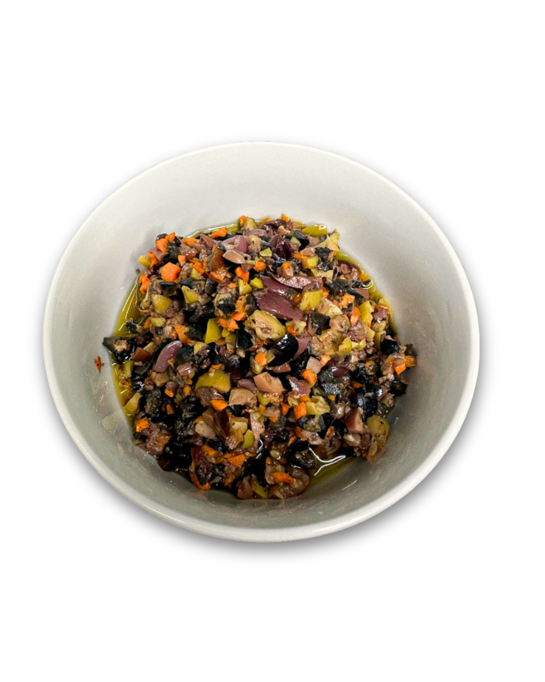 Mixed olives (Green, Black, Red, Kalamata), Carottes, Oil, Black pepper.